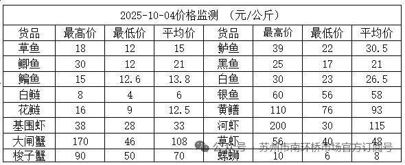 标题: 2025年10月4日苏州南环桥批发市场部分水产品批发价