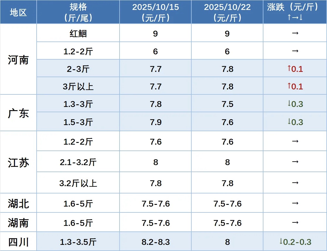 广东地区:1.3-3斤规格叉尾塘口价7.5元/斤,较上周下跌0.3元/斤;1.5-3斤规格的叉尾塘口价为7.6元/斤,较上周下跌0.3元/斤。