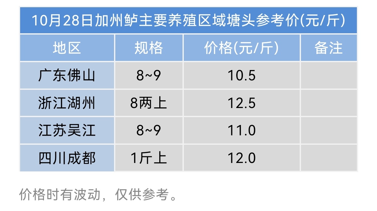 去年下半年至今年上半年,加州鲈行情表现亮眼,持续处于理想区间。受此利好驱动,今年下半年的加州鲈秋苗投放量大幅攀升。10月下旬,随着全国各主产区加州鲈新鱼集中上市,市场整体供过于求,行情延续下行态势。其中,广东、四川等主产区鱼价跌幅较为显著;湖北地区跌势放缓,价格暂时稳定;江浙地区鱼价小幅下跌。