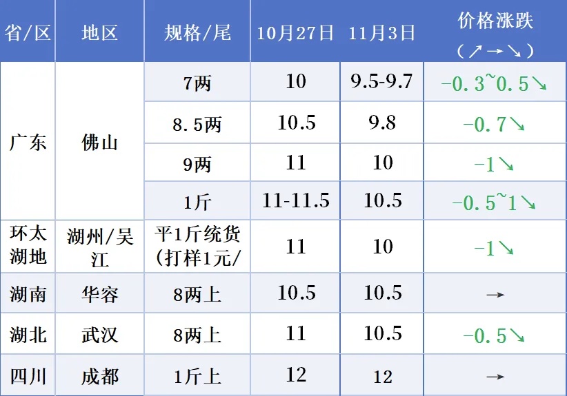 广东地区:11月3日,7两上、鱼头1.6-1.7斤塘头报9.5-9.7元/斤;8.5两上、鱼头1.5斤塘头报9.8元/斤;9两上、鱼头1.5斤塘头报10元/斤;1斤上、鱼头1.7-1.8斤报价10.5元/斤;统货、鱼头1.2-1.3斤塘头报价8元/斤,具体看鱼头、大鱼比例发价。“现在行情一般,挑鱼更严格一点,但是现在烂身花身很少,都是看鱼头条形发价,接下来估计还要跌。”