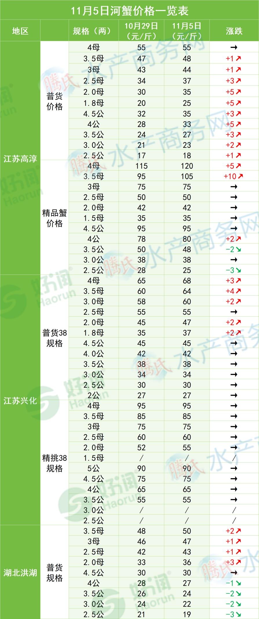 据11月5日市场报价,高淳精品蟹4.0母120元/斤,3.5母105元/斤,3.0母75元/斤,2.5母50元/斤,2母42元/斤;精品公蟹4.5公价格为95元/斤;4公价格为80元/斤;3.5公价格48元/斤;3公价格38元/斤;2.5公为25元/斤。