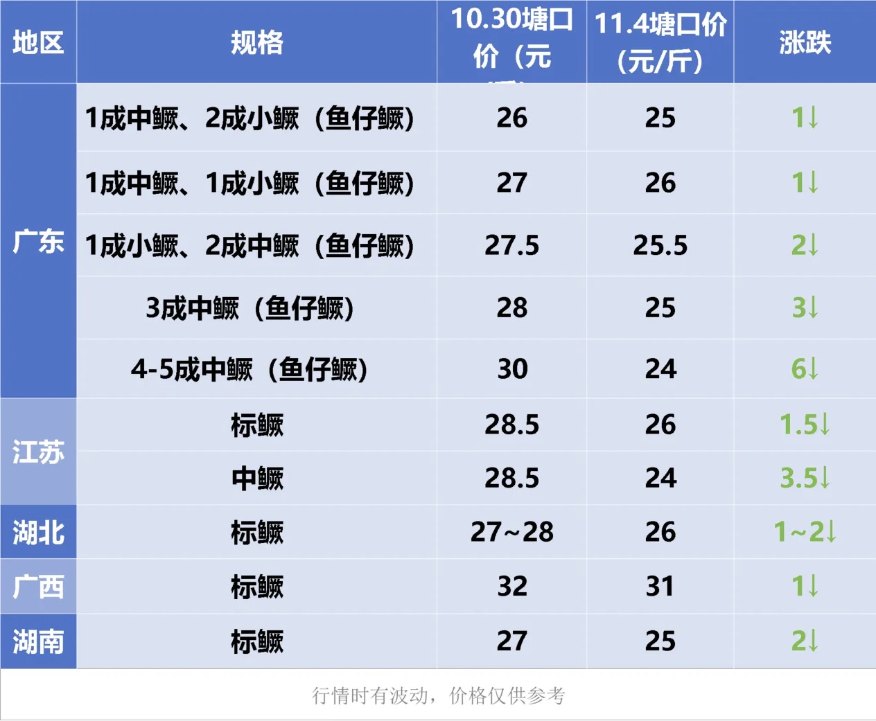 当前市场整体表现为消费需求疲软、流通速度放缓,尤其以中大规格鱼走货更为困难。受此影响,不少养殖户出现惜售或观望心态,广西区域甚至出现“有价无市”现象,行情整体承压下行。