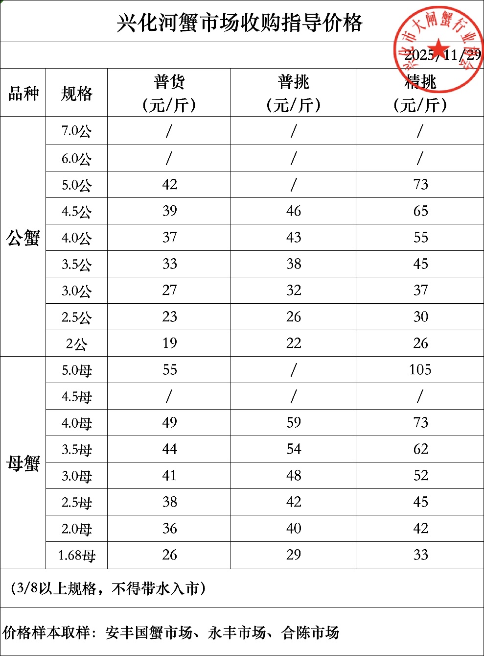 价格行情 2025年11月29日兴化河蟹市场收购指导价格