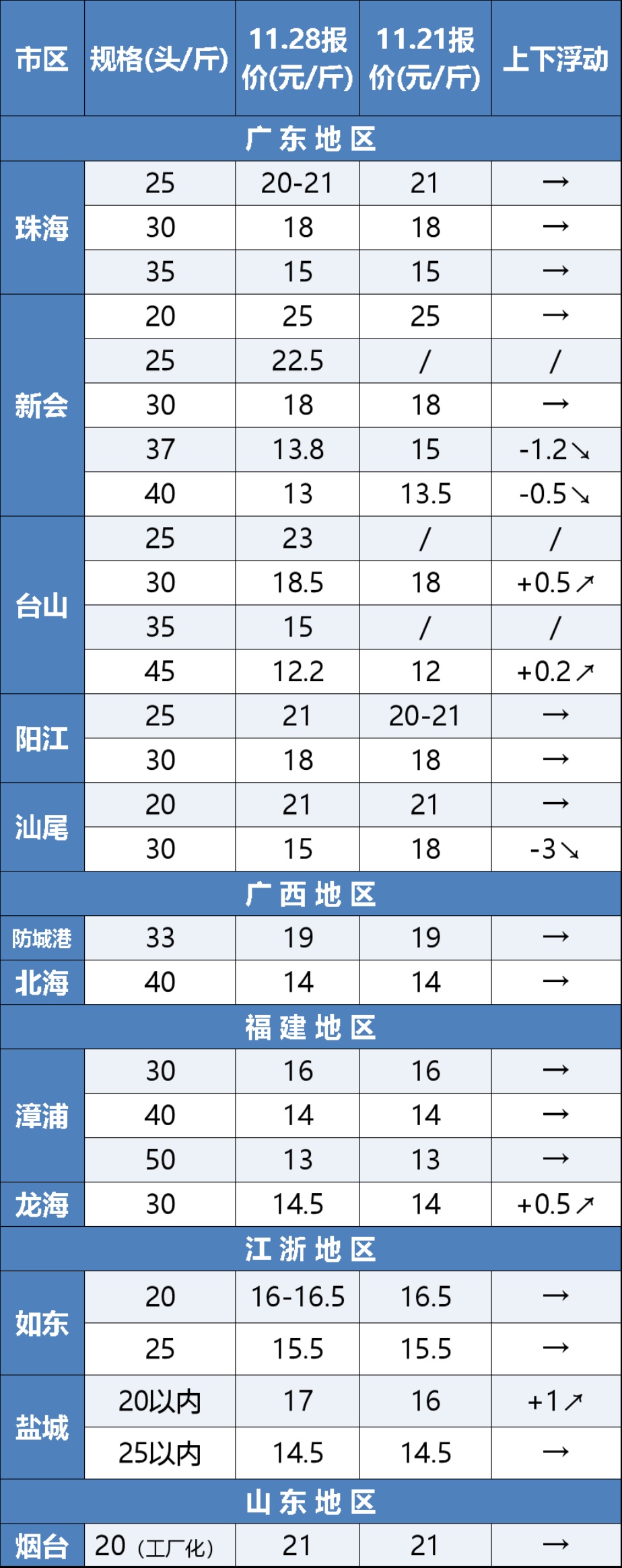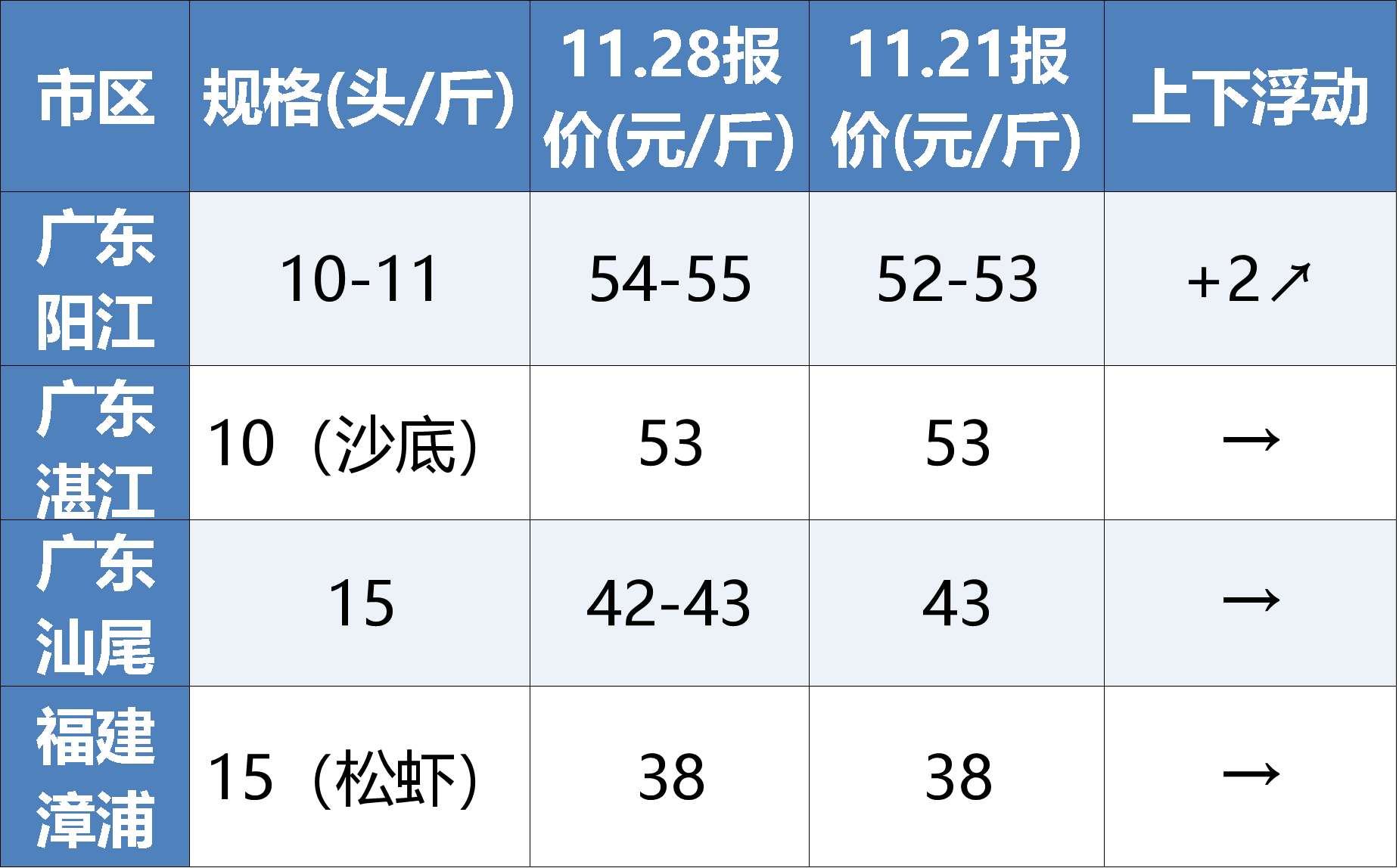 以下是广东、广西、福建等地南美白对虾、斑节虾、罗氏沼虾报价(11月28日)以及一周行情走势分析,供大家参考。