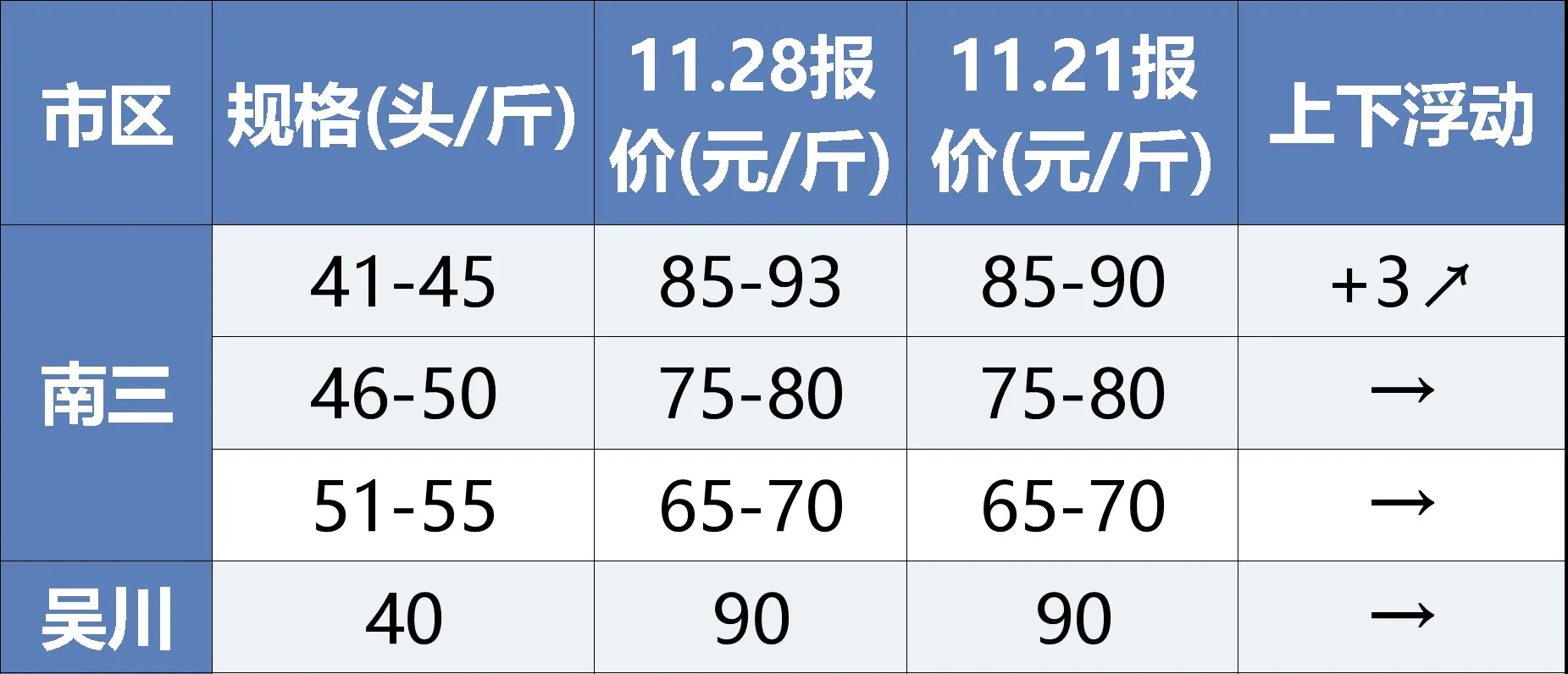 湛江:目前南三41-45条85-93元,46-50条75-80元,51-55条65-70元,本周虾价再涨3元;吴川40头90元,虾价小幅上调。